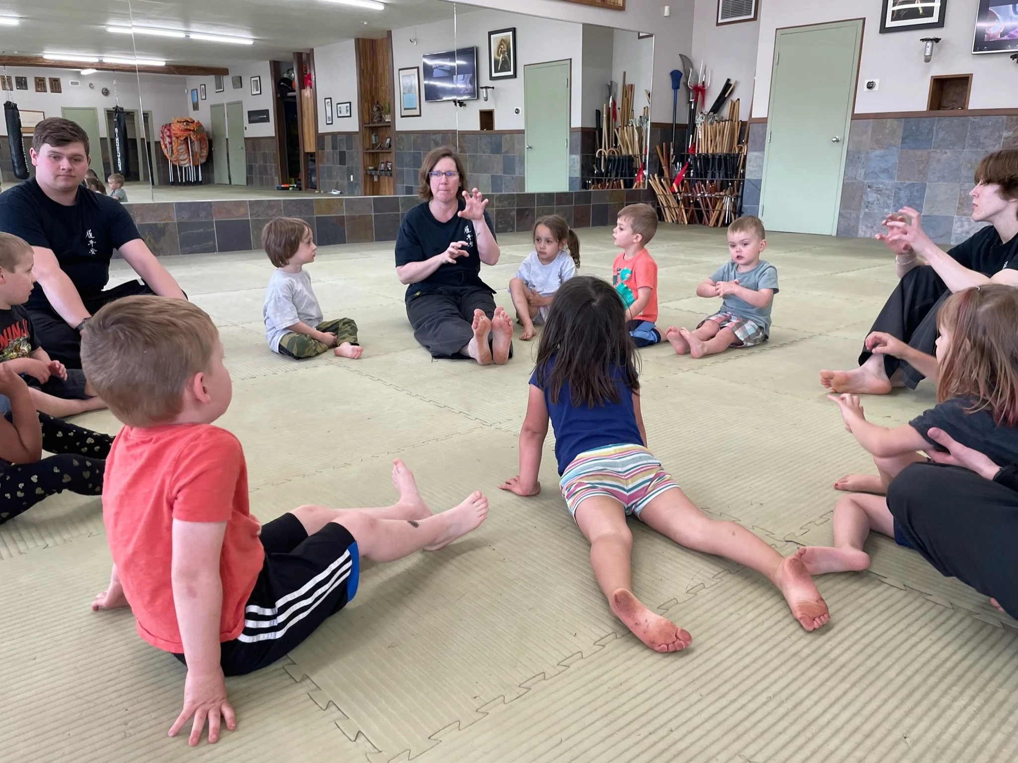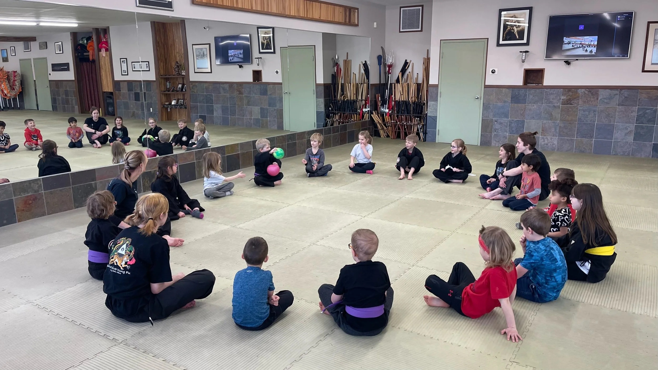 In our Tiny Tigers class we practiced various Kung Fu techniques such as kicks, punches and break falls with relays to the heavy bags. We also worked on our speed, agility and endurance with our “Circle of Dots” drill.