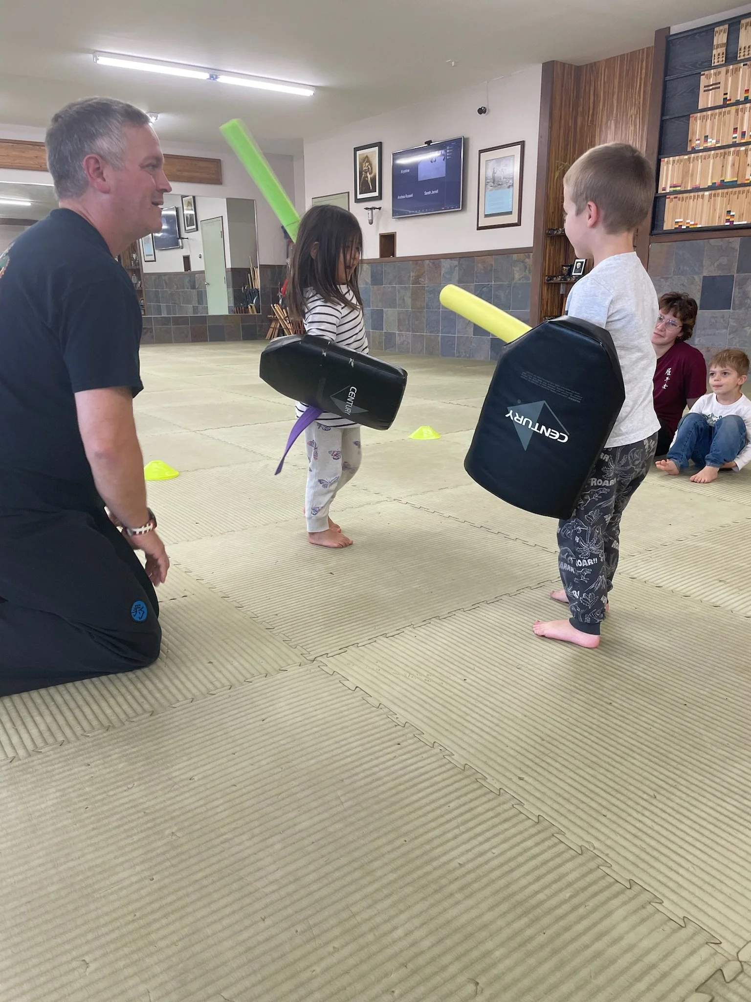 In both the Lil’ Leopard’s and Tiny Tigers classes this week we got to do one of our favourite things. Pool noodle sword fighting! Aside from the fact that pool noodle sword fighting is super fun and exciting, it also help us develop many other skills. One of the main aspects we focus on with this game is our ability to block, and then immediately counter with a strike. This is a skill we need as we progress through the ranks and get into sparring. In addition, and perhaps less noticeable, it helps us hone our reflexes, develop our eye for detail and promotes good sportsmanship and etiquette.