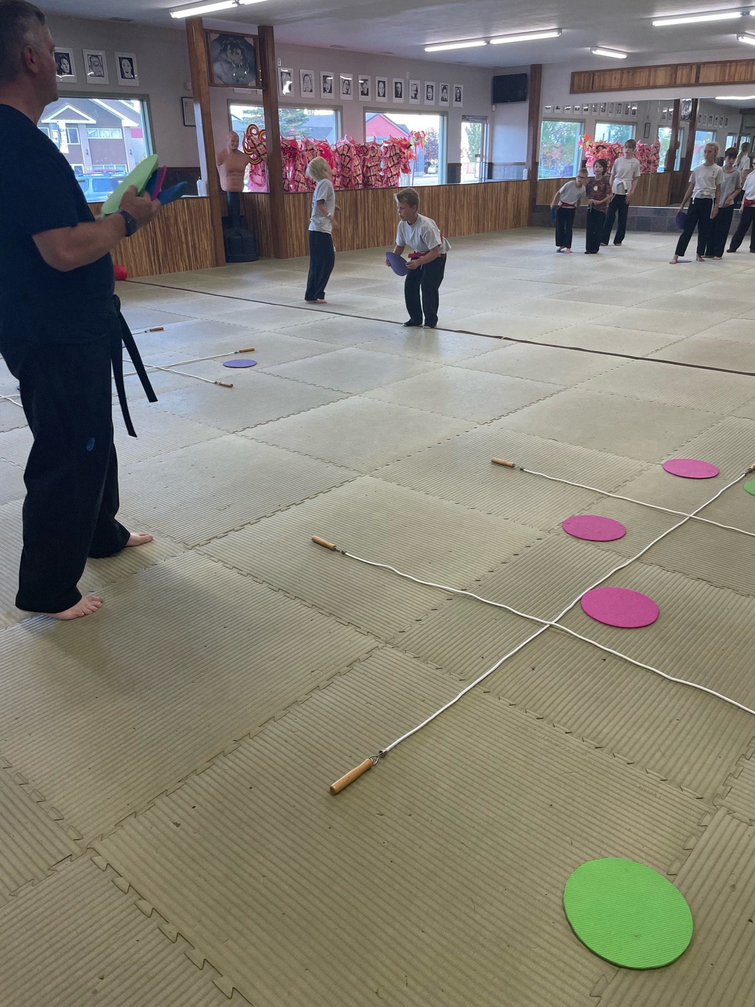 Leading into a long weekend, we like to finish our classes with a fun game. But even our games incorporate important aspects of Kung Fu. This time around, we played Tic Tac Toe, but with a twist. The students were challenged to toss their dot from a specific distance, onto the giant Tic Tac Toe board, in an effort to be the first team to get 3 of their dots in a row. Within this game we worked on stamina, quick problem solving, attention to detail and dynamic control…along with a bunch of fun and laughter.